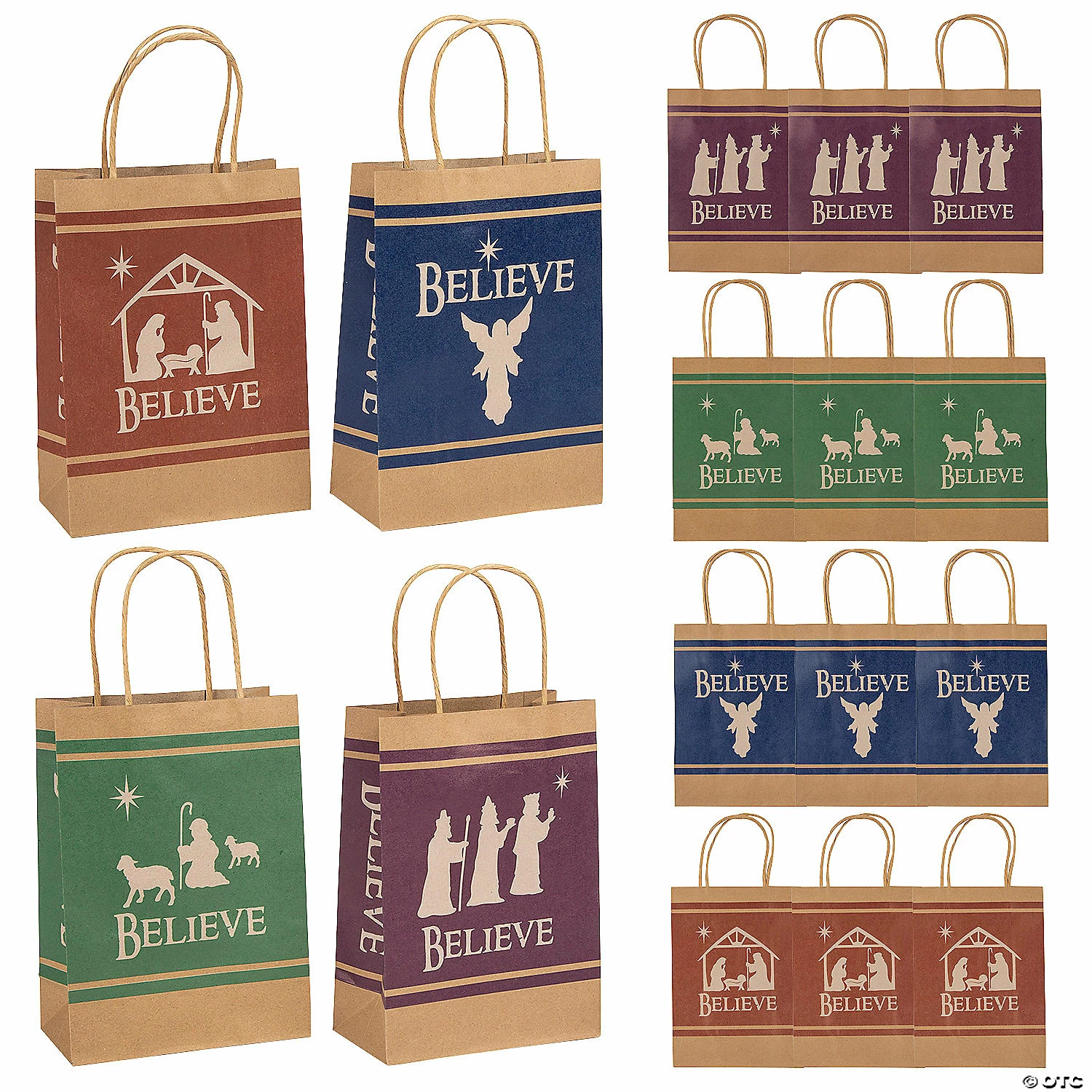 β’ Quality: These stylish gift bags are sure to make your present stand out from the pack. Just add some tissue paper for a beautiful gift presentation!β’ Reusable: Go green with this eco-friendly gift bag! They can even be reused for future gifts.β’ Easy Gift Wrapping: These sturdy gift bags are suitable for holding a variety of presents and come with easy-to-carry handles. They make wrapping any gift easy breezy!Product Description:Enjoy gift-giving with these gift bags! Perfect for storing holiday gifts and festive giveaways, these bags feature an angel with the word “Believe” with a star dotting the “i,” or a silhouette of the nativity scene, three wise men or the baby Jesus with a star over him. Bags come in green, blue, purple and red colors.Size: 6 1/2″ x 3 1/2″ x 9″ with 4″ handlesQuantity: 12Material: Kraft paperΒ© OTC