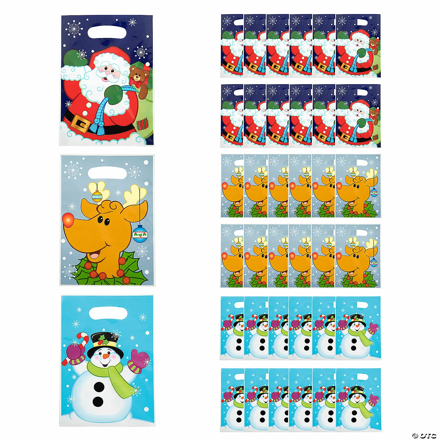 β’ Say Thanks with Sweets: Are you looking for an easy way to thank the people in your life during the holiday season? These multipurpose bags filled with Christmas cookies or other special treats are a sweet way to spread appreciation among party guests, students and teachers, or employees!β’ Perfect Size for Parties: These treat bags are just the right size for Christmas cookies, candy and holiday party favors. Fill them up with festive holiday treats and hand them out as party favors at your next Christmas party at school, in the office or at home.β’ Travel-friendly: Once the party is over, your guests will be happy to take home your favorite Christmas cookies, cake pops, cupcakes or other baked goods in these easy-to-carry bags. Product Description:Add fun and excitement to Christmas parties with these festive holiday party favor bags! Fill these treat bags with candy or small toys and hand one to each guest. Your guests will be delighted and youβll enjoy spreading Christmas cheer! Even Santa himself agrees these are a must-have addition to holiday party supplies. Includes 1 dozen of each design: Santa, reindeer and snowman. Plastic. (3 dozen per unit) 9″ x 6″ Β© OTCSize: 9βQuantity: 36Material: Plastic